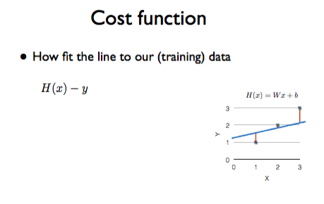 위의 도식에서 X=1일때와 2일때, 3일때는 각각 데이터와 선 간의 거리가 발생하는데, 이 때 만약 H(x)-y를 비용으로 계산한다면 1인 경우에는 식이 데이터 좌표보다 위에 있기 때문에 양수 값이 되지만 나머지 경우에는 음수 값이 될 것이다.